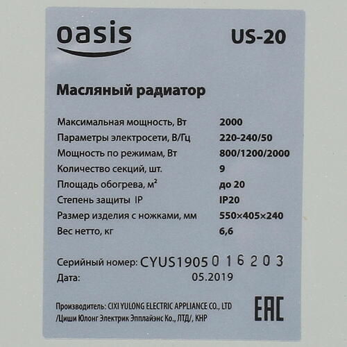 Масляный радиатор OASIS US-20