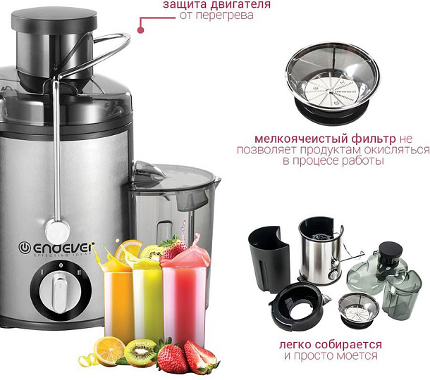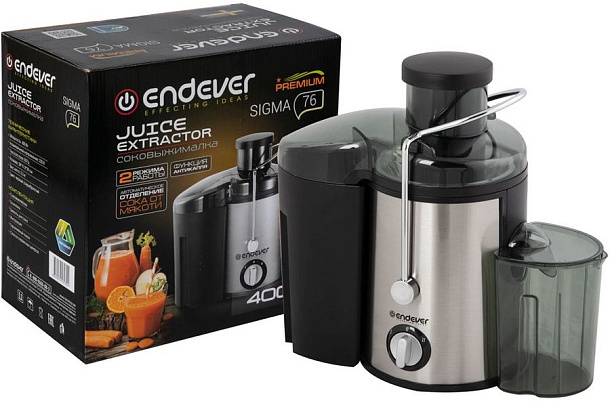 Электрическая соковыжималка ENDEVER Sigma-76 работает в 2-х скоростных режимах и имеет широкое отверстие для фруктов и овощей – 60 мм. Прибор работает с мощностью 400 Вт, с его помощью вы без усилий получите натуральный свежевыжатый сок. Безопасность использования гарантируется системой защитой двигателя от перегрева, а функция «Анти-капля» предотвращает разбрызгивание сока в процессе, чтобы кухня оставалась чистой. Детали прибора – фильтр, емкости и толкатель можно мыть в посудомоечной машине.