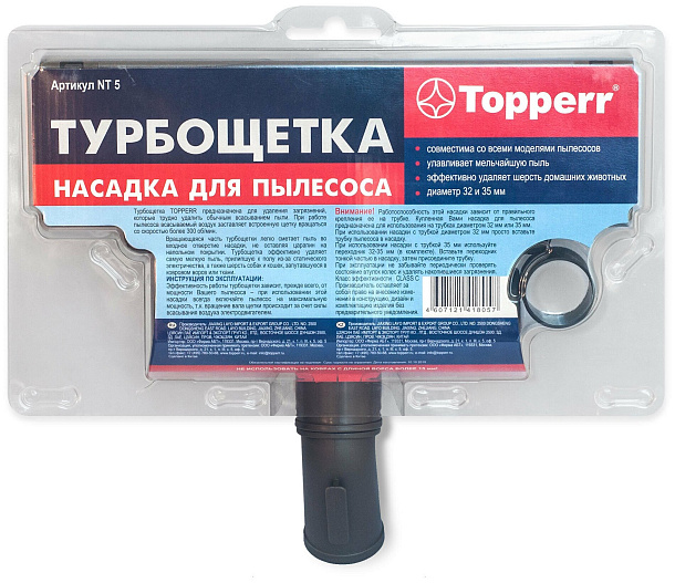 Насадку можно использовать на трубах диаметром от 32 до 35 мм. Она эффективно удаляет трудные загрязнения благодаря высокой скорости вращения щетки – более 300 оборотов в минуту. Щетка легко сметает в насадку мелкую пыль, шерсть животных и волосы, не оставляя следов на поверхности пола.