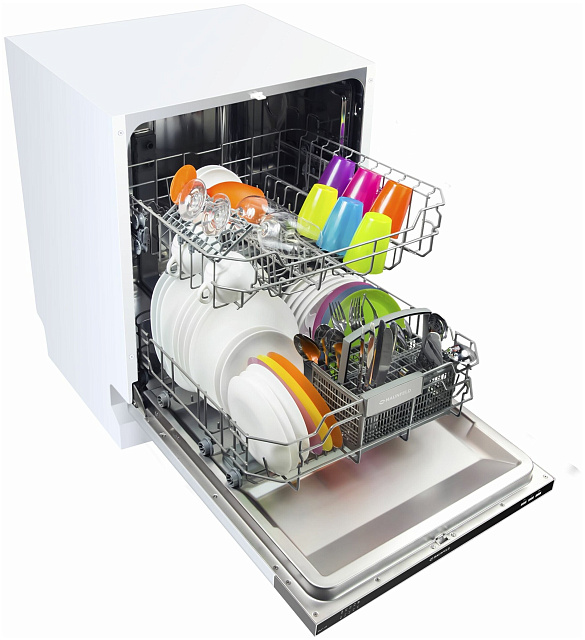 Машина вмещает до 12 комплектов посуды за раз. Для удобного расположения чашек, тарелок и кастрюль есть 2 выдвижные корзины.