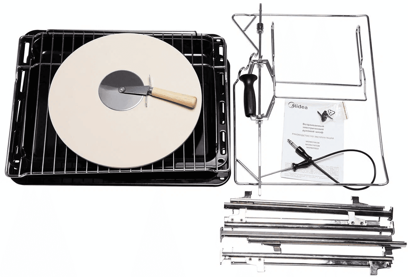 глубокий противень, держатель для противня, документация, камень для пиццы, нож для пиццы, решетка,